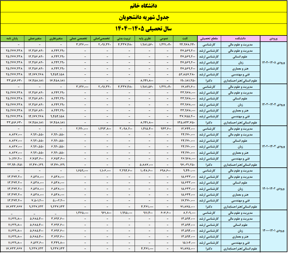شایان ذکر است سایر افرادی که در این رشته-گرایش‌ها پذیرفته شده‌اند، مشمول دریافت تسهیلات نبوده و به‌ علاوه ملزم به پرداخت شهریه طبق ضوابط عمومی سایر رشته‌های دانشگاه خاتم خواهند بود.